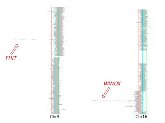Focal deletions of FHIT and WWOX due to expression of FRA3B and FRA16D. Array CGH results for HaCaT versus HaCaT/SM for chromosome 3 and 16. Green and red lines indicate log2 ratios of 0.4 and −0.4, respectively. Arrows point to the deletions encompassing FHIT and WWOX.