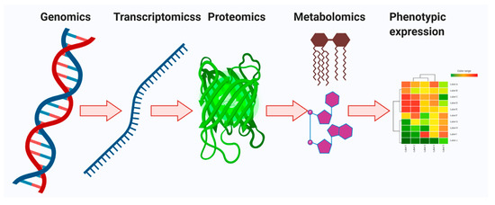 Metabolomics is a collection of measurements performed on biological samples for quantifying the several metabolites (metabolome) and evaluating fluctuations in metabolite levels [7]. Every single cell is transmitted over four different stages—genomics, transcriptomics, proteomics, and metabolomics (Figure 1). Among them, metabolomics has a particular advantage over other omics technologies. Metabolic target profiling and global metabolic profiling (untargeted metabolomics) have delivered molecular phenotypic variability that acts a therapeutic agent for specific diseases [7,8,9]. However, both targeted and untargeted metabolomics techniques in the metabolite pool play very important roles in heterogeneous cancer evolution. Moreover, both targeted and untargeted profiling can provide a better idea of the cellular conditions and molecular messages for the representation of cellular phenotypes. Additionally, they show wonderful applications in biomarker discovery [10,11].