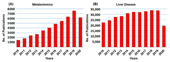 Historical development of publications in (A) metabolomics, and (B) liver diseases. Total sum of scientific publications between 2010 and 2020. The publications of metabolomics and liver diseases grew every year. All the data were accessed on PubMed on 21 September 2020.