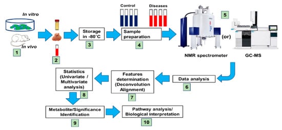 Appropriate analytical tools that allow comprehensive and robust metabolic analysis of various chemical structures is key to understanding the impact of metabolic signatures. Nuclear magnetic resonance (NMR), gas chromatography (GC), liquid chromatography (LC), Fourier transform infrared spectroscopy (FTIR) coupled with mass spectrometry (MS: LC/GC-MS), and capillary electrophoresis (CE-MS) have frequently existed in metabolomics profiling for metabolic stability and structural characterization of metabolome from cells, tissues, plant extracts, gut microbiota, and bacterial samples [12,13]. Analytical applications of NMR, LC/GC-MS, CE-MS, and FTIR were compared to investigate and assess the quality of analysis of given biofluids (Table 1). The dynamic changes in metabolite profile behind NMR spectroscopy and LC/GC-MS analytical technologies are used to generate a spectral profile according to intensities and mass-to-charge (m/z) ratios, respectively, from which can be extracted information that pertains to physiology and latent disease. Each technology has individual applications. However, leading machines of NMR and LC/GC-MS methods provide good quality of metabolomics large datasets [12,14].