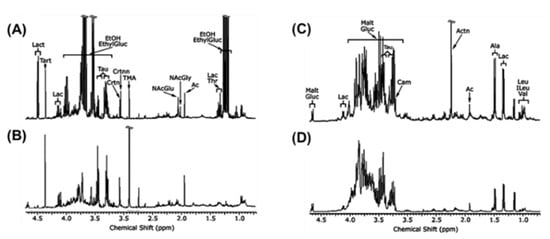 1H NMR spectrum of (A) mice urine with alcohol treatment; (B) mice urine with control; (C) mice liver with alcohol treatment; (D) mice liver with control. Solution state NMR experiments (400 MHz). The metabolites assignment of 1H NMR spectra data in alcohol-treated mice are annotated. EthylGluc, ethylglucuronide; EtOH, alcohol; Lac, lactate; Ac, acetate; NAcGly, N-acetylglycine; NAcGlu, N-acetylglutamine; TMA, trimethylamine; Crtnn, creatinine; Crtn, creatine; Tau, taurine; Tart, tartrate; Lact, lactose; Malt, maltose; Carn, carnitine; Actn, acetone; Ala, alanine; Leu, Leucine; ILeu, isoleucine; Val, valine. Adapted from reference [43] Copyright at 2008 Elsevier Inc.