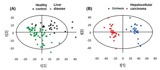 (A,B) Plot of cell metabolic discrimination by supervised PLS DA analysis. Pattern recognition of healthy control group and liver disease groups, which included cirrhosis and hepatocellular carcinoma samplesPattern recognition of healthy control group and liver disease groups, which included cirrhosis and hepatocellular carcinoma samples. Adapted with permission from [67], Copyright 2014, American Chemical Society.