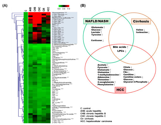Significant metabolome in liver diseases. (A) 67 metabolites from various types of liver diseases. All rows and columns display the targeted metabolites regulations and liver diseases, respectively. * p < 0.05, ** p < 0.01, *** p < 0.0001 was calculated. Adapted from references [72], Copyright 2011, European Association for the Study of the Liver. Published by Elsevier Ireland Ltd. (B) The regulation of up- and downregulated metabolites in HCC, cirrhosis, and non-alcoholic fatty liver disease (NAFLD)/non-alcoholic steatohepatitis (NASH) shown in Venn diagram. Adapted with permission from [73], Copyright 2013, European Association for the Study of the Liver. Published by Elsevier B.V.