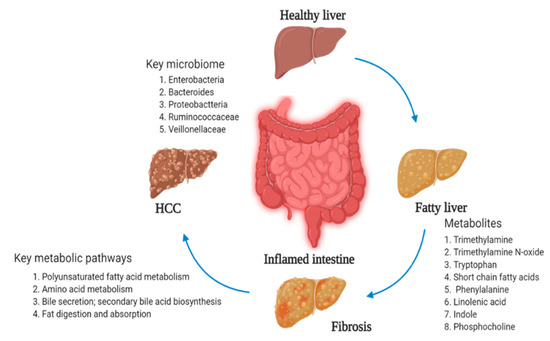 The communication between the liver and gut microbiome has developed, suggesting that the liver–gut axis is related to various developments in liver metabolic changes. Gut microbial metabolites show a vital part in the liver–gut axis or the liver–microbiome axis [90]. Various types of dominant bacterial products such as enterobacteria, bacteroides, and proteobacteria are rich in biopsy-proven liver patients [91]. Metabolomics-based analysis found an upregulation of acetinobacteria abundance but downregulation of bacteroidetes abundance in NAFLD patients [92]. Bacteria exhibit multiple effects on the development of liver disorders via saccharolytic and proteolytic fermentation in non-obese subjects. Ruminococcaceae and Veillonellaceae act as the leading microbiotas in fibrosis severity and liver fibrosis in NAFLD [93].