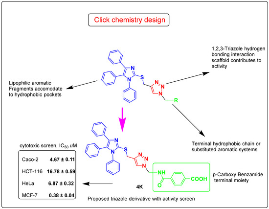 A library of novel imidazole-1,2,3-triazole hybrids were designed and synthesized based on the hybrid pharmacophore approach. Therefore, copper(I)catalyzed click reaction of thiopropargylated-imidazole 2 with several organoazides yielded two sets of imidazole-1,2,3-triazole hybrids carrying different un/functionalized alkyl/aryl side chains 4a–k and 6a–e. After full spectroscopic characterization using different spectral techniques (IR, 1H, 13C NMR) and elemental analyses, the resulted adducts were screened for their anticancer activity against four cancer cell lines (Caco-2, HCT-116, HeLa, and MCF-7) by the MTT assay and showed significant activity. In-silico molecular docking study was also investigated on one of the prominent cancer target receptors, i.e., glycogen synthase kinase-3β (GSK-3β), revealing a good binding interaction with our potent compound, 4k and was in agreement with the in vitro cytotoxic results. In addition, the ADMET profile was assessed for these novel derivatives to get an insight on their pharmacokinetic/dynamic attributes. Finally, this research design and synthesis offered click chemistry products with interesting biological motifs mainly 1,2,3 triazoles linked to phenyl imidazole as promising candidates for further investigation as anticancer drugs.