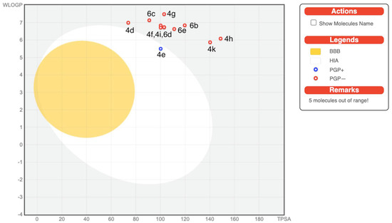 On the other hand, ADME predictions are documented in Table 3, revealing that all the compounds have low gastrointestinal absorptions (GI) except compound 4e. All the compounds displayed no blood brain barrier (BBB) permeation. Few of the tested compounds are P-gp (p-glycoprotein) inhibitors, i.e., 2, 4a–4c, and 4e. The BOILED-Egg diagram which is a pooled built-in graphical classification model for the prediction of BBB permeations, passive human gastrointestinal absorption (HIA), and P-gp substrates, is shown in Figure 2. In terms of metabolism, all the synthesized compounds were tested for inhibition of the Cytochrome P450 isomers, i.e., CYP1A2, CYP2C19, CYP2C9, CYP2D6, and CYP3A4. Most of the compounds are non-inhibitors of CYP1A2 and CYP2D6 with the exception of 4b, as it is a CYP1A2 inhibitor and 4a which also inhibits both CYP1A2 and CYP2D6. Most of the tested molecules are CYP3A4 inhibitors. The tested compounds emerged to be non-inhibitors of CYP2D6. The skin permeability coefficient (log Kp; with Kp in cm/s) values display low permeability through the skin for most of the compounds except, compound 2, 4a–4c which displayed good skin permeability.