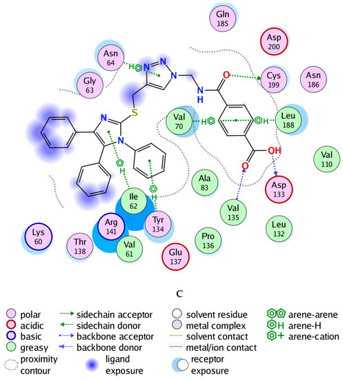 Glycogen synthase kinase-3 beta (GSK-3β) is a promising target with an overexpressed oncogene in different breast cancers [49], so we evaluated the binding modes of our potent compound 4k as a selective MCF-7 cytotoxic agent against the GSK-3β ATP binding pocket and confirmed the overall prognostic dependency of breast cancer patients on the GSK-3β inhibition effect. We docked the 4k test ligand on our target protein, i.e., GSK-3β (PDB ID: 1UV5), in order to analyze the binding pattern and affinity using the software MOE. Docking poses of the bound and tested compound 4k are depicted in Figure 3A–C. The compound 4k displayed an excellent binding interaction and affinity, i.e., −9.8 kcal/mol toward GSK-3β target compared to the reference drug; 6-Bromoindirubin-3′-oxime with −8.8 kcal/mol. The interaction analysis of the bound ligand; 6-bromoindirubin-3′-oxime, exhibited that the cyclic nitrogen of the pyrrole ring donates a hydrogen bond to the peptide carbonyl oxygen of Val135, while the cyclic nitrogen of the lactam ring donates a hydrogen bond to the carbonyl oxygen of Asp133, and the lactam carbonyl oxygen accepts a hydrogen bond from the backbone amide of Val135 and Tyr134. The molecular docking studies revealed that the compound 4k emerged to be a promising drug candidate; on the account of its lowest binding energy, i.e., −9.8 kcal/mol with the active site residues of the target receptor GSK-3β and this might be one of the reasons for its good in vitro anticancer activity. The putative interaction of compound 4k with GSK3 suggested that the terminal aromatic ring might display two hydrogen bond interactions through the COOH substituent with the backbone carbonyl group of Asp133 and the backbone amide of Val135, respectively. Moreover, another essential linker hydrogen bond through the carbonyl of amide with conserved Cys199 stabilized the compound in the pocket. In addition, the fit of the aromatic systems for the whole compound occurs through a group of aromatic stacking interactions with corresponding residues; Ile62, Tyr134, Asn64 for triazole ring, Val70, and Leu188 that might support selective binding. The 2D and 3D analysis of the target compound 4k mapped to the 6-Bromoindirubin-3′-oxime as a reference is shown in Figure 3. Taken together, these observations might rationalize the observed cytotoxic activity of 4k through the inhibitory effect of overexpressed GSK-3β within the cancer cell lines.