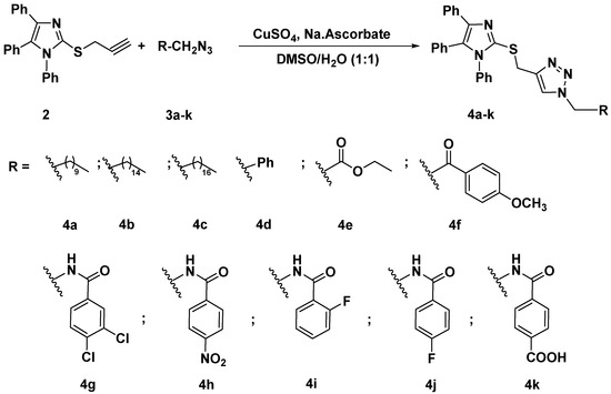 Click synthesis of imidazole-1,2,3-triazole hybrids carrying un/functionalized alkyl and/or phenyl acetamide side chain 4a–k.