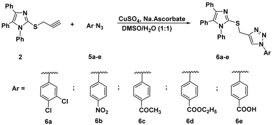 Click synthesis of imidazole-1,2,3-triazole hybrids carrying un/functionalized aromatic unit 6a–e.