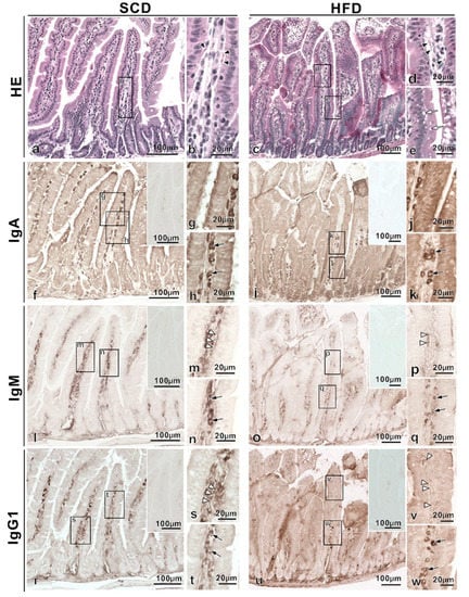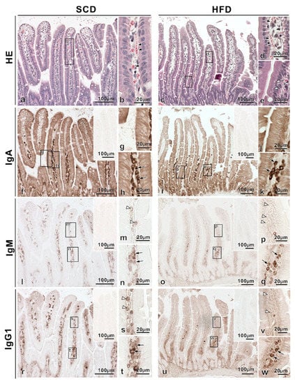 Additionally, histological findings were compared among 20-week-old mice fed different diets as above (Figure 3). HE of 20-week-old mice revealed red blood cells, characteristic of IVCT, similar to 12-week-old mice (Figure 3b,d). Of note, the vacuoles observed in 12-week-old HFD-fed mice were even more pronounced in 20-week-old HFD-fed mice (Figure 3e). Additionally, IgA immunoreactivity in the cytoplasm of epithelial cells was widely detected in 20-week-old SCD-fed mice compared to 12-week-old SCD-fed mice (Figure 3g), and many IgA-immunopositive cells were also observed from the bottom to top of LP in intestinal villi (Figure 3f, arrows in 3h). Meanwhile, IgA immunoreactivity in 20-week-old HFD-fed mice was localized to the bottom of the LP (Figure 3j), with a reduced population of IgA-immunopositive cells (Figure 3i, arrows in 3k), compared to that in 12-week HFD-fed mice. Conversely, IgM and IgG1 immunoreactive blood vessels (Figure 3p,v) and Ig-immunopositive cells (Figure 3q,w) were similar between 20- and 12-week-old HFD-fed mice; however, the blood vessels were slightly more immunoreactive in 20-week-old HFD-fed mice than in 12-week-old HFD-fed mice (Figure 2p,v). The above findings were semi-quantified and are summarized in Table 1.