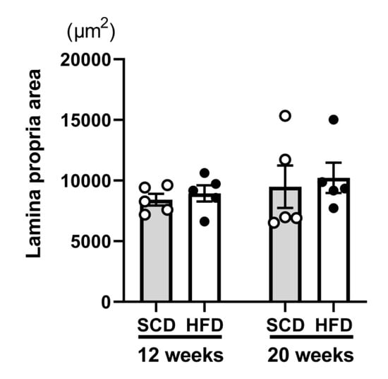 Comparison of the areas of the lamina propria used in quantitative analyses. There were no differences in the areas of the lamina propria analyzed either between the age groups (12-week and 20-week) or between the diet models (standard chow diet and high-fat diet) (Two-way ANOVA). The same number of animals was used in all groups (n = 5 per group).