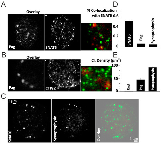 Localization of Pag and Synaptophysin. (A) Immunostained images of Pag and SNAT6 with an overlay image in the inset. (B) Immunostained images of Pag and CTPs2 with an overlay image in the inset. Scale bar 2 µM in (A,B). (C) Immunostained images of SNAT6 and Synaptophysin with an overlay image on the right. Scale bar 2 µM in (C). (D) Co-localization of SNAT6 with Pag and Synaptophysin measured as described in the methods. Random (Rnd) regions selected were used as control. Both Pag and Synaptophysin co-localized with SNAT6 at a significantly (p < 0.001) higher percentage compared to Rnd regions (E) Density of clusters of SNAT6, Pag and Synaptophysin was assessed as described in the methods. Note of density of SNAT6 which is significantly (p < 0.001) higher than Pag or Synaptophysin. All the experiments in the figure were repeated for 2–3 times each with each of the bar graph representing more than 15 cells obtained from separate experiments.