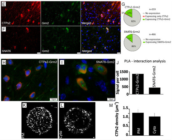 Interestingly at subcellular level, our staining showed complete overlap between Grm2 and CTPs2 whereas the green staining of Grm2 and the red staining of SNAT6 were rather complementary to each other (Figure 3H,I). This was in spite of CTPs2 localized equally in the plasma membrane apart from its cytosolic localization (Figure 3K–M). To explore this expression pattern further, we used proximity ligation assays (PLA) with the same combination of proteins. Upon quantification of PLA signals per cell, Grm2 and CTPs2 seem to be in closer proximity than Grm2 and SNAT6 (Figure 3J). There were more PLA signals recorded for Grm2 and CTPs2 compared to those for Grm2 and SNAT6, which complements the pattern we observed in the immunohistochemistry staining.