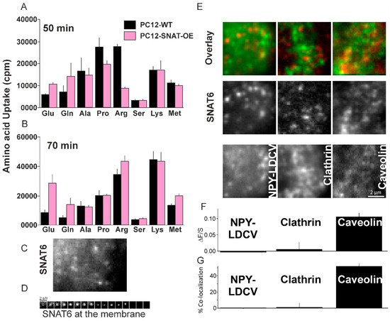 Role of SNAT6 in amino acid uptake and internalization. (A) Uptake in counts per minute (cpm) for 50 min by wildtype PC12 cells and PC12 cells overexpressing SNAT6 are plotted. (B) Uptake in counts per minute (cpm) for 70 min by wildtype PC12 cells and PC12 cells overexpressing SNAT6 are plotted. 3H-labeled Glutamine, glutamate, alanine, proline, arginine, serine, lysine and methionine are used for both time points. All measurements were performed in duplicates for multiple times and mean value is shown. Significantly higher uptake (p < 0.001) is shown for the amino acids - glutamine and glutamate in PC12-SNAT6-OE cells compared to PC12-wt cells after 50 mins. (C) A TIRF microscopy image showing cells overexpressing SNAT6-EGFP at the plasma membrane (D) Time series strip showing disappearance of SNAT6-EGFP from the plasma membrane in presence of glutamine. (E) Images of a cell overexpressing SNAT6-EGFP in red with NPY-mCherry or Clathrin-mCherry or Caveolin-mCherry in green channels respectively with a corresponding image in the overlay. (F) Quantification of binding to the SNAT6 site (ΔF/S) for NPY, clathrin and Caveolin respectively (described in methods). Localization of SNAT with Caveolin was significantly higher compared to NPY or clathrin (p < 0.001). (G) Co-localization from the images similar to E were analyzed (described in methods). SNAT co-localization with caveolin was significantly higher than its co-localization with NPY of clathrin (p < 0.005). All the TIRF imaging experiments were repeated at least 3 times with at least 8 cells per time.
