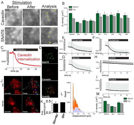 SNAT6 association with caveolin at the plasma membrane was confirmed by immunostaining (Figure 5D) and the functionality of the transporter was evaluated in presence of SNAT6 substrates (tested previously in Figure 4A,B) that include alanine, proline, arginine, serine, lysine, and methionine apart from glutamate and glutamine. Live cells were incubated for 2 min in presence of each of the amino acids and images acquired before and after incubation (Figure 5A). To further substantiate the findings, the number of puncta forming clusters from SNAT6 and caveolin were counted automatically using an ImageJ function named “find maxima” [27]. The density of SNAT6 and Caveolin decreased after incubation with glutamate, glutamine, and alanine with none of other amino acids showing any effect on SNAT6 and caveolin (Figure 5B).