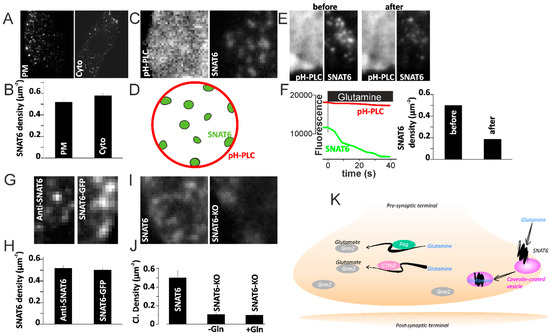 SNAT6 downstream signalling. (A) Immunostained images of SNAT6 at the plasma membrane (PM) and cytosol (cyto) of the cell. (B) Density of SNAT6 clusters was assessed using plugin called “find maxima” described in the methods. (C) Cells co-transfected using PtdIns(4,5)P2 labeled with PH domains of PLCδ1-mRFP (pH-PLC) and SNAT6 labeled with GFP images obtained using TIRF microscopy. (D) Cartoon showing SNAT6 distribution in the cell and PIP2 at the plasma membrane. (E) Images as in C for cells before stimulating with glutamine and after stimulating with glutamine. (F) Trace showing fluorescence of the entire single cell for SNAT6 (green) and PIP2 marker pH-PLC (red). Note that the stimulation with glutamine was initiated at time zero. The density of SNAT6 clusters before and after stimulation is shown on the right. (G) Images showing SNAT6 immunostained using a specific antibody and SNAT6 tagged to GFP. (H) Density of SNAT6 from the images similar to displayed in E analyzed using “find maxima” as described in the methods. (I) Images from SNAT6 immunolabeled cells fixed after siRNA mediated knockdown of SNAT6 or untransfected control cells. (J) Density of immunostained SNAT6 from the untrasfected cells or cells undergone siRNA mediated knockdown of SNAT6 fixed with or without prior Gln stimulation analyzed using “find maxima” as described in the methods. Note SNAT6-KO cells have significantly fewer clusters (p < 0.001). All experiments were repeated two or three times independently and each bar graphs represents 12–50 cells each. (K) A proposed model illustrating how SNAT6 might be regulating the glutamate–glutamine cycle: SNAT6 transports in glutamine from astrocytes to the pre-synaptic terminal of excitatory neurons. SNAT6–caveolin complexes internalize upon binding to glutamine. Two enzymes Pag and CTPs2 then convert the glutamine to glutamate via two separate pathways. The glutamate produced then binds to the glutamate-receptor Grm2 prior to its release.