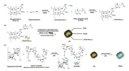 Preparation of the Pheo a/EAE7-conjugated γ-PGA/MPEG-PLGA/HA (PPHE) polymeric nanoparticles. Schematic diagram of the –synthetic process of the (a) Pheo a-conjugated γ-PGA (γ-PGA-Pheo a) prepared through the carbodiimide reaction to form amide linkage, (b) self-assembled γ-PGA-Pheo a/MPEG-PLGA (PP) nanoparticles, and (c) targeting ligand EAE7-decorated HA (HA-EAE7)-containing PPHE polymeric nanoparticles prepared via the amide bone formation and layer-by-layer (LBL) self-assembly method.
