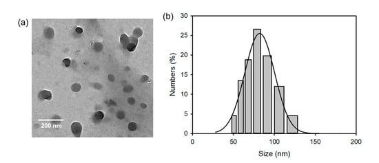 MPEG-PLGA is an amphiphilic block copolymer that can self-assemble into a core–shell type of polymeric nanoparticle with a controlled size at the nanometer level [30,31]. These polymeric nanoparticles are suitable for drug delivery because of their excellent biocompatibility, appropriate stability, and high drug-loading content. Therefore, the PPHE polymeric nanoparticles were readily prepared via self-assembly and encapsulation in aqueous solutions and exhibited a quasi-spherical shape with an average diameter of 71.5 ± 6.7 nm (Figure 2a). The size of the PPHE polymeric nanoparticles was confirmed through the DLS method. The nanoparticles were almost monodispersed with narrow size distribution and a diameter of 80.5 ± 17.6 nm (Figure 2b).