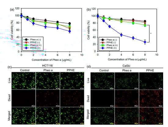 In vitro photodynamic therapy (PDT) efficacy of the free Pheo a and PPHE polymeric nanoparticles. Phototoxicity of different concentrations of the free Pheo a and PPHE polymeric nanoparticles on the (a) HCT116 and (b) CaSki cells before laser irradiation (Pheo a (−) and PPHE (−)) and after laser irradiation (Pheo a (+) and PPHE (+)) using a 671 nm laser (42 mW/cm2, 1 min) (n = 6). * p < 0.05 for comparison between two treatment groups. Fluorescence microscopy images of the (c) HCT116 and (d) CaSki cells after treatment with free Pheo a and PPHE polymeric nanoparticles (6 μg/mL Pheo a) and laser irradiation using a 671 nm laser (42 mW/cm2, 1 min). Live and dead cells were stained with calcein-AM (green) and EthD-1 (red), respectively.