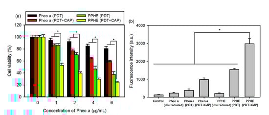 Even though the PDT is an important noninvasive therapeutic modality in cancer therapy, it also exhibits adverse side effects, such as phototoxic damage to healthy normal tissues and an unsatisfactory therapeutic efficacy by insufficient ROS generation [12,14,16]. We tried using the combination of PDT with CAP therapy to enhance the therapeutic efficacy on cervical cancer and solve the abovementioned problems. As expected, the CaSki cell viability was significantly reduced by the combination of PDT with CAP treatment at all tested concentrations of free Pheo a and PPHE, indicating that the PDT/CAP combinatory treatment effectively inhibited the cell proliferation in a dose-dependent manner (Figure 4a). The cell viability after the PDT treatment with free Pheo a decreased from 80 to 60% by subsequent CAP treatment. Lower cell viability (53 and 40%) was also achieved, even at low PPHE concentrations of 1 and 2 μg/mL. In other words, the PDT/CAP combinatory modality could more effectively kill cancer cells.