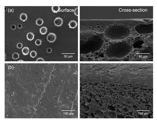 SEM micrographs of the surfaces and cross-sections of (a) the PLGA/γ-PGA/Pluronic 17R4 porous scaffolds with 3D bimodal pore structure fabricated via the thermally-induced phase separation (TIPS) method and (b) the CaSki cells grown on porous scaffolds for 15 days.