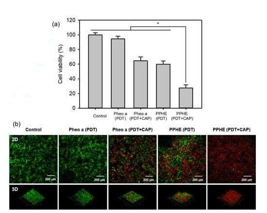 The cytotoxicity of the PDT/CAP combinatory treatment on the 3D cell culture model of the CaSki cells was evaluated by the MTT assay. The result exhibited a similar pattern with the results from the 2D cell culture model. Figure 8a shows that only the PDT-treated CaSki cells with free Pheo a or PPHE (4 μg/mL Pheo a) exhibited higher cell viability (94.6% for free Pheo a and 60.0% for PPHE) in the 3D cell culture model compared with that (84.9% for free Pheo a and 46.7% for PPHE) in the 2D cell culture model, indicating that the increased resistance of cancer cells to anticancer drugs in the 3D cell culture system when compared with the 2D cell culture system. The structural architecture in a 3D tumor tissue model regulated the differentiated cell functions through the changes in cell shapes and increased the cell–cell and cell–matrix interactions [37]. These changes in the cancer cell function extensively affected the response of a tumor tissue model on external drugs, resulting in cancer cells exhibiting increased resistance to anticancer drugs. However, the PDT/CAP combinatory treatment in the 2D and 3D cell culture models displayed almost the same therapeutic efficacy. The cancer cell viability decreased to below 30% after the PDT/CAP combinatory treatment using PPHE, indicating that the combined PDT and CAP therapy exhibited an obvious therapeutic activity on the CaSki cells.