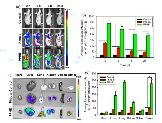In vivo biodistribution of the free Ce6 and PPC nanoparticles. (a) In vivo time-dependent whole-body imaging of the tumor-bearing mice after the tail vein injection of free Pheo a and PPHE polymeric nanoparticles and (b) quantification of the average fluorescence signals in the tumor site. (c) Ex vivo fluorescence images of the tumor and normal organs (i.e., liver, lung, spleen, kidney, and heart) excised from the tumor-bearing mice at 24 h post-injection and (d) quantification of the average fluorescence signals of the tumor and normal organs. * p < 0.05 for comparison between two treatment groups.