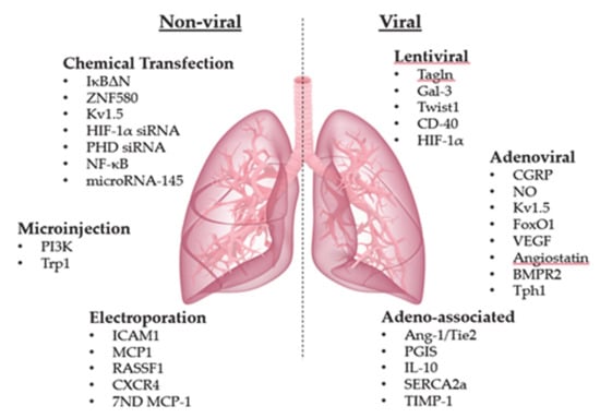 Non-viral and viral delivery systems in pulmonary vascular cells. 7‑NH2terminus-deleted dominant negative inhibitor of the MCP-1 (7ND MCP‑1); Angiopoietin 1 (Ang‑1); Angiotensin II (Ang II); Bone morphogenetic protein receptor type 2 (BMPR2); Cluster of differentiation 40 (CD‑40); Calcitonin gene-related peptide (CGRP); C‑X‑C chemokine receptor type 4 (CXCR-4); Galectin‑3 (Gal‑3); Fas-induced apoptosis (FIA); Forkhead box O1 (FoxO1); Hypoxia inducible factor‑1α (HIF‑1α); Inhibitor of kappa B mutant (IκBΔN); Intercellular adhesion molecule-1 (ICAM-1); Interleukin 10, (IL‑10); Monocyte chemoattractant protein-1 (MCP‑1); Nitric Oxide (NO); Nuclear factor κB (NF‑κB); Phosphatidylinositol 3-kinase (PI3K); Prolyl hydroxylase domain (PHD); Prostacyclin synthase (PGIS); Ras association domain family 1A (RASSF1A); Sarco‑/endoplasmic reticulum calcium-ATPase 2a (SERCA2a); SMC-specific Rho-associated coiled-coil containing protein kinase 2 (SM22α/ROCK2); Tissue inhibitor matrix metalloproteinase 1 (TIMP‑1); Transgelin (Tagln); Transient receptor potential-1 (Trp1); Tryptophan hydroxylase-1 (Tph1); Tyrosine-protein kinase receptor (Tie2); Twist related protein 1 (Twist); Vascular endothelial growth factor (VEGF); Voltage-gated potassium channel member 5 (Kv1.5); Zinc Finger Protein 580 (ZNF580).