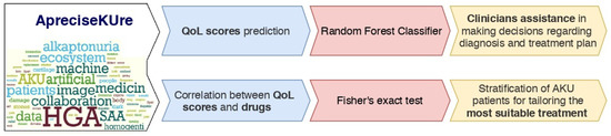 The workflow of our study is summarized in Figure 1. The first goal of this work was the prediction of the QoL scores based on both personal and clinical AKU patients’ information collected in ApreciseKUre. A fine-tuned scoring system can indeed assist clinicians in making sound decisions regarding diagnosis and treatment plan. Then, it was better investigated the correlation between the values of the QoL scores and the drugs the patients take. This could pave the way to stratify AKU patients and to tailor the most suitable treatment to each patient sub-group in a typical PM perspective. Tailoring treatment to the patient has become a promising approach for maximizing efficacy and minimizing drug toxicity and it is not trivial in an ultra-rare disease like AKU. We believe that this AKU-dedicated preliminary study can represent a proof of principle applicable not only to other rare diseases, but it could be also valuable to larger research communities with an increasing number of affected patients.