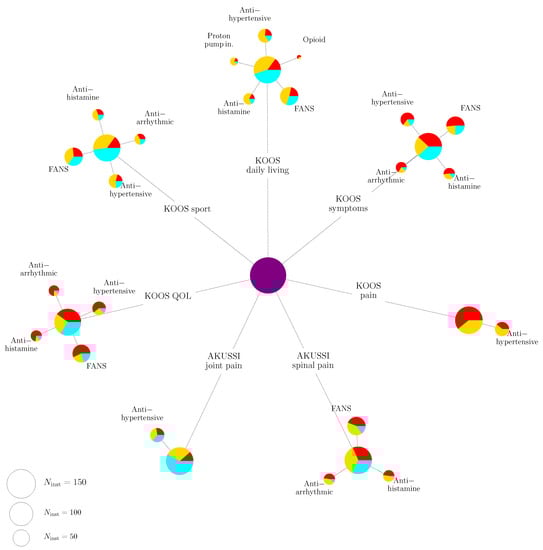 In Figure 2, for each QoL score a first pie chart is represented, whose dimension is proportional to the number of patients for which there is information for that given QoL score. The colours are divided according to the psycho-physical state of the patient: from red (bad health conditions) to cyan (absence of pain). In the second level of pie charts, only the drugs for which evidence of correlation has been found are shown. The area of the circle is proportional to the number of patients taking that drug for that given QoL score. As a reference, we also show the size of the circles corresponding to three benchmark values for the number of patients, i.e., 150, 100 and 50.