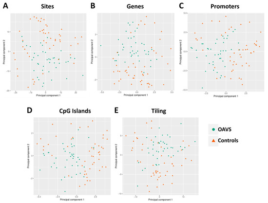 Scatter plot locating samples in the first two principal components at (A) sites, (B) genes, (C) promoters, (D) CpG islands, and (E) tiling.