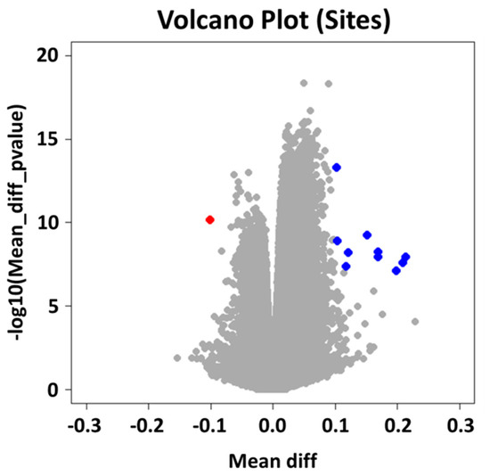 Volcano plot for differential methylation: CpG sites meeting p-value and methylation difference thresholds are depicted as red (hypo-methylated) and blue (hyper-methylated) dots.