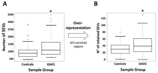 The burden of SEVs in the OAVS cohort was calculated as described in the “Methods” section and compared to that observed in controls: the number resulted significantly higher (Figure 3A). To identify significantly SEV-enriched regions, for each patient and each control, we carried out an over-representation analysis by using a sliding window algorithm based on a cumulative hypergeometric test (see Materials and Methods for details). When we compared OAVS and controls for the number of retained CpGs, we observed that this number remains significantly higher in the OAVS group (Figure 3B).