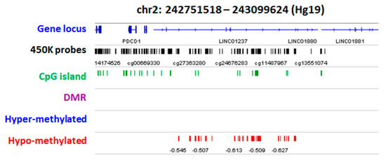 Prioritization was carried out through the computational tool Phenolyzer (phenotype-based gene analyzer) (http://phenolyzer.wglab.org/) [36]. Analyses returned a list of genes with a low normalized score indicative of a poor association with seed genes linked to selected keywords. However, we found a relatively high association with the “craniofacial” term by combining the keywords. For example, among the most ranked genes enriched in hyper-methylated probes, we discovered genes such as Guanine Nucleotide Binding Protein ((GNAS) G Protein), Alpha Stimulating—Chromosome 20) (8 contiguous hyper-methylated probes (chr20:57465439-57465775) in the promoter of the bi-allelic isoform of GNAS locus) and EDN3 (Endothelin 3—Chr. 20) (Supplementary Figure S5). On the other side, the prioritization of hypo-methylated enriched genes highlighted genes including RPS6KA2 (Ribosomal Protein S6 Kinase A2—Chr. 6), Signaling Receptor and Transporter of Retinol ((STRA6) STRA6—Chromosome 15), and MSX1 (Msh Homeobox 1—Chr. 4) (Supplementary Figure S6). We then performed a literature-based gene prioritization: first, we screened our gene-associated deregulations by intersecting the gene lists with those confirmed or candidates to be causative of OAVS that emerged from both genetic (exome sequencing) or cytogenetic (SNP-array) studies. No epigenetic deregulations were found to be associated to MYT1 gene [22,23] or others proposed loci including ZYG11B [25], AMIGO2 [24], OTX2/YPEL1/CRKL [21,37], and NKX3-2 (BAPX1) [29]. The only positive matching was found for the gene Xyloside Xylosyltransferase1 (XXYLT1) localized in a region previously reported for a de novo microduplication on chromosome 3 (3q29) in an OAVS patient [38]. This gene is enriched in hypo-methylated CpGs in the 3’ terminal region of the gene in one patient (OAVS05). No epigenetic deregulations were also found by inspecting our deregulation lists for the presence of genes causing other syndromes in differential diagnosis with OAVS such as TCOF1, POLR1C, POLR1D (Treacher–Collins) [39,40], CHD7 and SEMA3E (Charge) [41,42], SALL1 (Townes–Brocks) [43] and EYA1, SIX1, and SIX5 (Branchiootic syndrome 1) [44,45]. We also searched for deregulated enrichment in imprinted regions (http://www.imprinting-disorders.eu/). The comparison yielded two OAVS samples with distinct deregulation associated with imprinted regions. Sample OAVS4 showed five out of seven probes hypo-methylated in the germline maternally methylated ERLIN2 gene (intron 6; chr8:37604992-37606088), while sample OAVS29 had six out of ten probes hyper-methylated in the secondary paternally methylated ZNF597:TSS-DMR (chr16:492828-3494463). The probes identifiers and relative coordinates are supplied as Supplementary Table S11. The SEV lists were also visually inspected using a Genome Viewer (Integrative Genomics Viewer (IGV)) to detect other possible candidate regions. This approach highlighted a sample (OAVS08) with a consistent hypo-methylation (10 CpG sites) in the telomeric region of chromosome 2. Deregulation has become more evident (78 hypo-methylated probes) by detecting SEVs from beta matrices obtained from RnBeads [46], which, despite ChAMP [47], does not massively filter the proximal telomeric regions in the quality control phase (Figure 4).