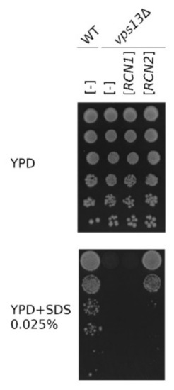 A vps13 mutants exhibit several phenotypes: they show defects in protein transport [49,50,51], sporulation [52], and actin cytoskeleton organization [47]. Our studies indicate the alteration of calcium homeostasis in vps13Δ cells and a functional connection between Vps13 and calcium signaling [30]. To this list, we recently added a new phenotype: hypersensitivity to low concentrations of a commonly used amphiphilic detergent, sodium dodecyl sulfate (SDS), which we used in a genetic screen for multicopy suppressors of the vps13-I2749R mutation. This screen resulted in the identification of fragments of the MYO3 gene (MYO3-N) and of the FET4 gene [30,53] as suppressors, and both were also effective in vps13Δ cells. In this screen, we also found that a plasmid containing the RCN2 gene, which encodes a negative regulator of calcineurin, restored the growth of the vps13Δ mutant in the presence of SDS (Figure 1). The paralogous RCN1 gene, which encodes the other calcineurin regulator, has not been isolated; thus, we directly tested whether the overexpression of RCN1 [54] could restore the growth of vps13Δ cells on SDS medium. In contrast to RCN2, overexpressed RCN1 was not active as a suppressor (Figure 1). These results support the view that specific downregulation of calcium signaling, including that caused by Rcn2, is beneficial for vps13Δ mutant cells.