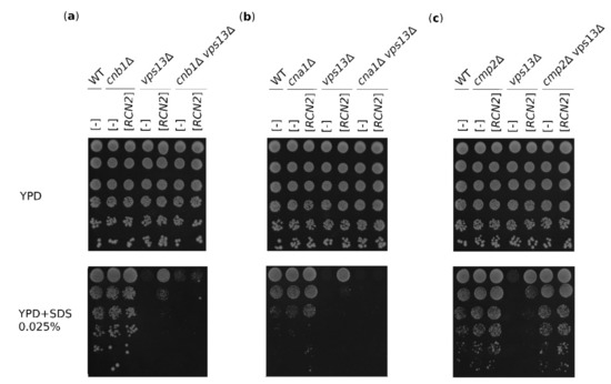 RCANs are also involved in calcineurin-independent processes, such as binding mRNA and affecting its stability [12,13], so we tested whether Rcn2-based suppression requires calcineurin presence and/or activity. For this reason, the double mutants cnb1Δ vps13Δ, cna1Δ vps13Δ, and cmp2Δ vps13Δ were constructed that lacked either a regulatory (Cnb1) or catalytic (Cna1 or Cmp2) subunit. These mutants were transformed with an RCN2-bearing plasmid, and their growth on SDS-containing media was tested. The double cnb1Δ vps13Δ mutant was hypersensitive to SDS, and RCN2 overexpression did not cause suppression (Figure 3a). Similarly, in the cna1Δ vps13Δ double mutant, there was no RCN2-based suppression (Figure 3b). Because the phosphatase is inactive in the cnb1Δ strain [19], the lack of suppression in the cnb1Δ vps13Δ mutant indicates that functional calcineurin is required. Interestingly, the cmp2Δ mutation caused cells not to be SDS-sensitive, and the double mutant cmp2Δ vps13Δ grew as single cmp2Δ (Figure 3c). Thus, the cmp2Δ mutation is epistatic to vps13Δ. Altogether, these results indicate that in the presence of SDS stress, the vps13Δ mutation triggers changes in the cell that can be overcome by the reduction of Cmp2 activity. This could be obtained by RCN2 overexpression or deletion of the CMP2 gene, but the active Cna1–Cnb1 phosphatase complexes are required.