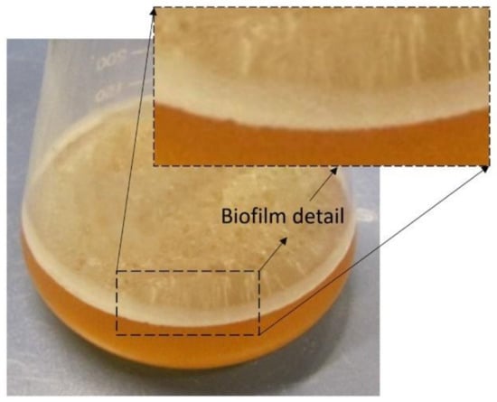 As far as P. kluyveri is concerned, the cells are slightly ovoid and about 2–10 µm, and it is very difficult to distinguish their shape from the shape of S. cerevisiae or S. ellipsoideus cells. Its ability to produce a film during its development in must is very characteristic and allows us to easily distinguish the species among other yeasts (Figure 1). The ability to distinguish this film formation is very useful at the industrial scale to quickly evaluate implantation success when using commercial products that contain P. kluyveri. This species is able to produce pseudohyphae in plate cultures but not in liquid fermentation. It can also produce hat-shaped ascospores. The species only ferments glucose and shows growth in liquid media containing glucose, ethanol, or glycerol. Like other Pichia species, P. kluyveri resists high osmotic pressure, presenting optimal growth in 10% NaCl or 5% glucose [16]. It has been usually isolated from rooted fruit and green parts of plants, being widely distributed in all type of ecosystems [17].