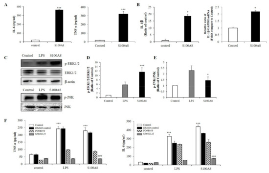 2.2. S100A8 Induced Pro-Inflammatory Cytokine Production Via Phosphorylation of ERK and JNK in BV-2 Cells