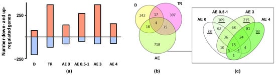Disuse (D), long-term aerobic exercise training (TR) and acute aerobic exercise (AE) induce multidirectional changes in the expression levels of different sets of genes in the human vastus lateralis muscle. (a) The numbers of genes that were up-regulated and down-regulated in each group; (b) Overlap between the sets of differentially expressed genes in each group; (c) The dynamics of the transcriptional response to acute exercise. The number of unique genes at each time point is underlined.