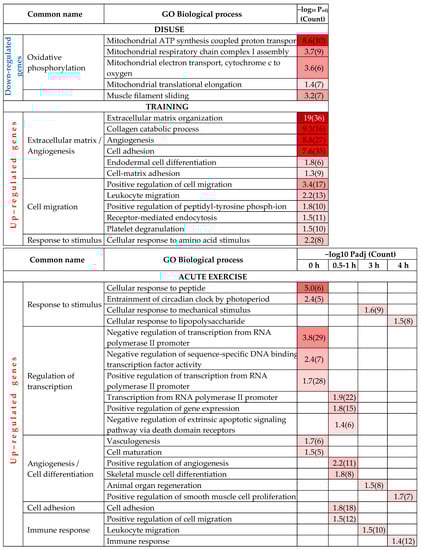 Transcriptomic changes in the human vastus lateralis muscle induced by disuse (D), long-term aerobic exercise training (TR) and acute aerobic exercise (AE) are associated with different biological processes. The heat map shows the P-value adjusted (Padj). Dark red shading denotes the most significant Gene Ontology (GO) terms. The count indicates the number of genes enriched into a term.