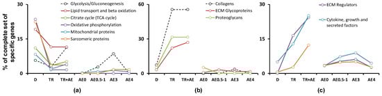 Genes related to different protein classes or metabolic pathways demonstrate different patterns (a–c) of transcriptional regulation following disuse (D), long-term aerobic exercise training (TR) and acute aerobic exercise (AE). The percentages of the complete sets of specific genes.