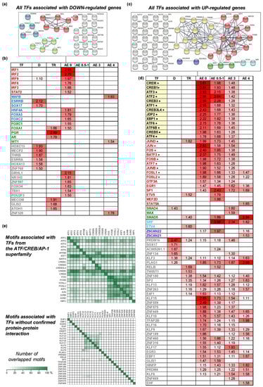 The most enriched (FEadj > 1.5) transcription factors associated with transcriptomic responses to disuse or exercise. (a,c) A transcription factor binding site enrichment analysis showing transcription factors (TFs) associated with genes that were down-regulated (a) or up-regulated (c) following each intervention; then a protein–protein interaction analysis was performed to identify clusters (denoted by different colors) of TFs that potentially form dimers or multimers. Darker edges indicate higher interaction scores; (b,d) The results of a transcription factor binding site enrichment analysis showing TFs associated with genes that were down-regulated (b) or up-regulated (d) following disuse (D), long-term aerobic exercise training (TR) or acute aerobic exercise (AE) at a specific time of recovery. The heat map and numbers show FEadj (dark red denotes the highest values). TFs related to the ATF/CREB/AP-1 superfamily are marked by •; (e) The relative numbers of overlapping motifs associated with bZIP factors from the ATF/CREB/AP-1 superfamily, forming protein–protein interactions (top) and with other factors related to the acute exercise response (bottom).