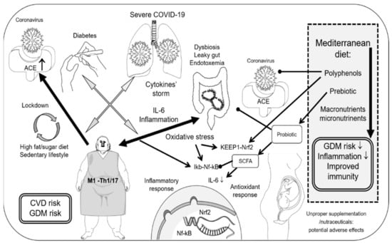 COVID-19, diabesity, and MedDiet interactions. ACE: Angiotensin-Converting Enzyme; COVID-19: Coronavirus Disease 2019, CVD: cardiovascular disease; GDM: Gestational Diabetes Mellitus; KEAP1: Kelch-Like ECH-Associated Protein 1; I-κB: Kappa b inhibitor; IL: interleukin; Nrf2: Nuclear Factor Erythroid-Derived 2-Like; SCFA: Short-Chain Fatty Acids.