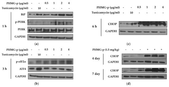 ER stress induced by PHMG-p in A549 cells and mice. To evaluate the effect of PHMG-p exposure on ER stress, the expression of ER stress components was measured depending on exposure time and PHMG-p concentration. We exposed PHMG-p for (a) 1, (b) 3, and (c) 6 h. (d) The expression level of CHOP was evaluated with Western blotting after 4 and 7 days of intratracheal administration in mice.