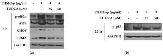 To validate that PHMG-p-induced ER stress triggered apoptosis, we pretreated A549 cells with tauroursodeoxycholic acid (TUDCA) as an ER stress inhibitor, and then exposed them to PHMG-p. When pretreated with TUDCA, ER stress components, including p-eIF2α, ATF4, and CHOP, decreased in the presence of PHMG-p (Figure 4a). Moreover, PUMA was attenuated. After 24 h of PHMG-p exposure, p-p53 was also decreased by TUDCA (Figure 4b), which implied that decreased ER stress alleviated the apoptotic pathway of PHMG-p. Flow cytometry results demonstrated that TUDCA decreased the percentiles of both early apoptotic and late apoptotic cells from 15.02% and 15.90% to 6.76% and 10.10%, respectively (Figure 5). In the same manner as the result of TUDCA pretreatment, the PERK inhibitors (GSK2606414 and GSK2656157) attenuated PHMG-p-induced apoptosis (Figure A2).