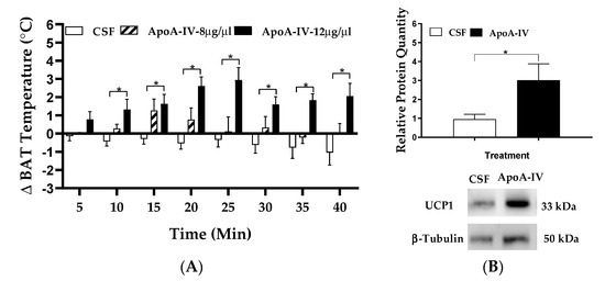 The effects of ApoA-IV on BAT temperature and UCP1 protein levels. BAT temperature was measured every 5 min for up to 40 min in mice following administration of either ApoA-IV at two different doses or CSF (A). The mice received central administration of either CSF (1 µL) or ApoA-IV (12 µg) into the third ventricle, and BAT was collected at 40 min post-injection. UCP1 protein in BAT was measured by immunoblot analysis (B). Data are expressed as the means ± SEM for 7–8 mice per group. * Represents a significant difference relative to the corresponding CSF-treated BAT (p < 0.5).