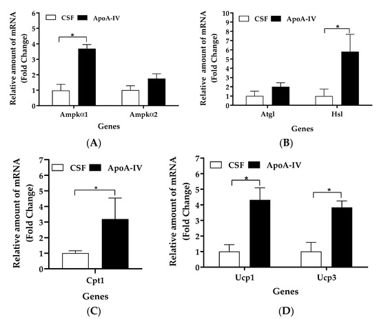 Compared to CSF treatments, ApoA-IV significantly increased gene expression levels of Ampkα1, Hsl, Cpt1, Ucp1, and Ucp3 in BAT (p < 0.05, Figure 2A–D). No significant differences in Ampkα2 and Atgl expression levels in BAT were observed between the CSF- and ApoA-IV-treated groups (Figure 2A,B).