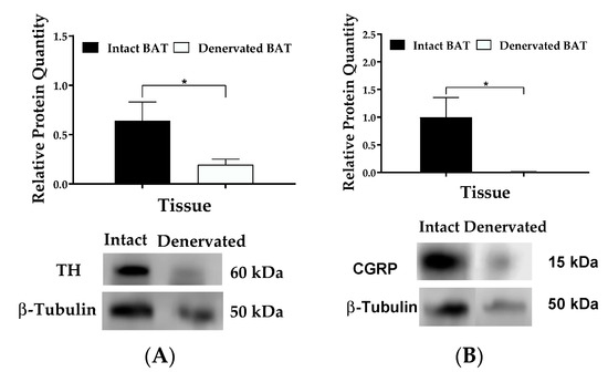 Sympathetic and sensory nerves are present in BAT [38,39]. In peripheral sympathetic neurons, tyrosine hydroxylase (TH) is the rate-limiting enzyme for the synthesis of NE, and NE is released at nerve terminals when sympathetic neurons are stimulated [40]. Thus, the expression of the TH protein can be used as a marker for sympathetic innervation to verify successful denervation of sympathetic nerves [41,42]. Calcitonin gene-related peptide (CGRP), expressed in most primary sensory neurons, is a commonly used marker for sensory innervation [41]. In the present experiment, unilaterally denervated BAT had significantly lower levels of the TH and CGRP proteins than the contralateral intact BAT (p < 0.05, Figure 3), indicating that mice had successful denervation of sympathetic and sensory nerves in one side of BAT.