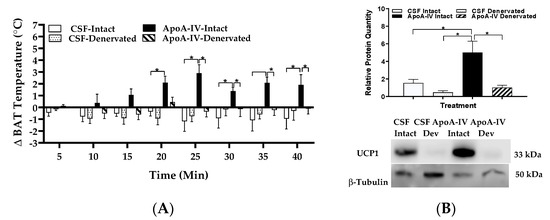 Relative to CSF treatment, ApoA-IV significantly elevated temperature in the intact BAT starting at 20 min after injection (p < 0.05, Figure 4A). In contrast, ApoA-IV-induced BAT temperature in the denervated BAT was lower than that in the intact BAT starting at 25 min after injection (p < 0.05, Figure 4A). In the intact BAT, ApoA-IV treatment significantly increased UCP1 protein expression relative to CSF treatment (p < 0.05, Figure 4B). In contrast, denervation of BAT significantly attenuated ApoA-IV-induced UCP1 protein (p < 0.05, Figure 4B). These findings are consistent with the findings in experiment 1 and suggest that surgical denervation diminishes ApoA-IV-induced UCP1-dependent BAT thermogenesis.