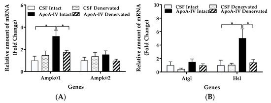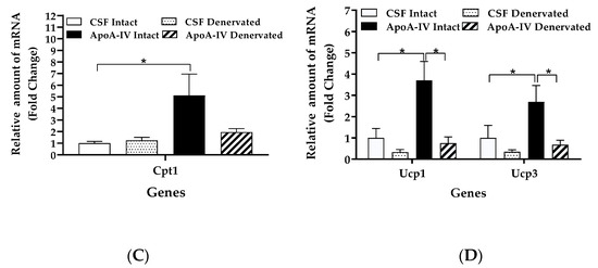 Relative to CSF, ApoA-IV treatment enhanced gene expression levels of Ampkα1, Hsl, Cpt1, Ucp1, and Ucp3 in intact BAT (p < 0.05, Figure 5A–D). In contrast, denervation reduced the ApoA-IV-induced increase in Ampkα1, Hsl, Ucp1, and Ucp3; the difference did not reach statistical significance for Cpt1 (Figure 5A–D). Relative to CSF, ApoA-IV treatment did not increase Ampkα2 or Atgl mRNA levels (Figure 5A,B). These findings suggest that central administration of ApoA-IV into the third ventricle elevates UCP1-dependent thermogenesis in BAT, and innervation is required for this action.